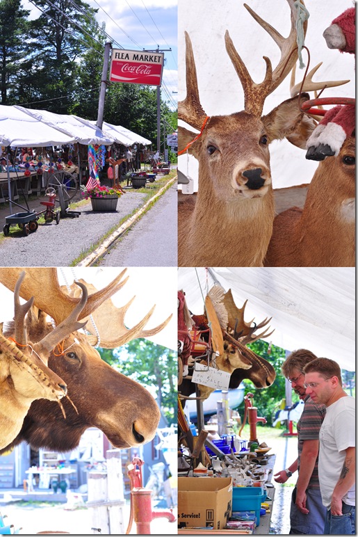 Naturally, a Maine flea market along a busy coastal highway must have Maine-ish things for the tourista. Like stuffed deer, or black bears or a cute moose. Or lobster buoys and cages. Seeing a moose close up like this typically happens only at a fleamarkt. Bears, too. If you are lucky.