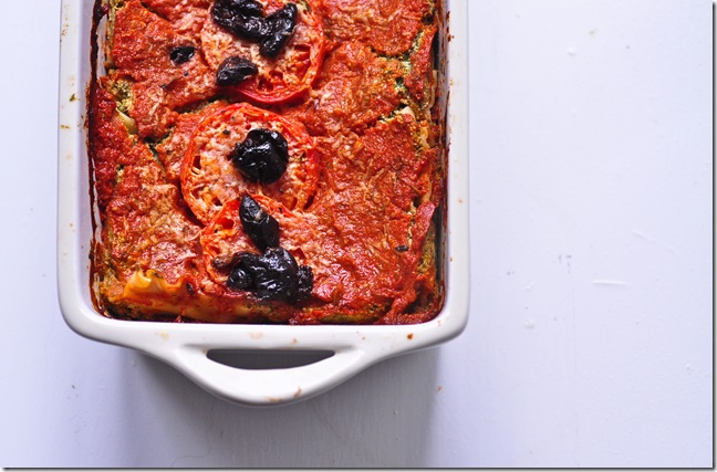 Spread one-quarter of the marinara sauce on bottom of small, long baking dish. Cover with one-third of the (cooked or uncooked, works with both) noodles (break them up so that they fit width-wise), then add 1/3 of spinach filling, and ladle on another layer of sauce. Repeat twice. Finish with final layer of marinara sauce, some fresh sliced tomato, kalamata olives and vegan mozzarella.